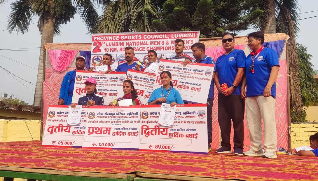 लीलाधर वली दाङ, १२ वैशाख । घोराहीमा भएको ‘दोश्रो लुम्बिनी राष्ट्रिय खुला पुरुष तथा महिला १० किलोमिटर रोड रेस प्रतियोगिता–२०८३’ मा पुरुषतर्फ नेपाली सेनाका खड्गबहादुर खड्का र महिलातर्फ पूर्णलक्ष्मी न्यौपाने विजेता बन्नुभएको छ । लुम्बिनी प्रदेश खेलकुद परिषद्को आयोजनामा शनिबार