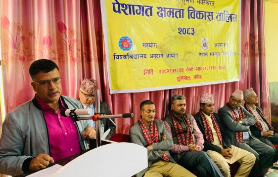 दुर्गालाल केसी काभ्रे, ४ बैशाख– नेपाल संस्कृत विश्वविद्यालयका प्राध्यापकहरुका लागि शुक्रबारदेखि काभ्रेको धुलिखेलमा पेशागत क्षमता विकास तालिम शुरु भएको छ । संस्कृत विश्वविद्यालयको आयोजना र विश्वविद्यालय अनुदान आयोगको सहयोगमा सञ्चालित तालिममा संस्कृत विश्वविद्यालयका साथै त्रिभुवन विश्वविद्यालय र काठमाण्डौ विश्वविद्यालयका प्राध्यापकहरुले