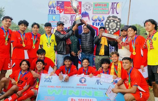 दाङ, २४ मंसिर । स्व. सुनिल पुन मगर स्मृति दोस्रो रनिङ शिल्ड फुटबल प्रतियोगिताको उपाधि युएनबिसी घोराहीले जितेको छ । घोराही उपमहानगरपालिका–१० नारायणपुरस्थीत बिपी बाटिका खेल मैदानमा बुधवार भएको प्रतियोगिताको