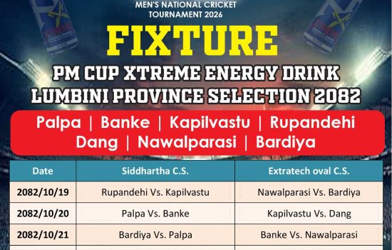 दाङ, १५ माघ । प्रधानमन्त्री कप एक दिवसीय पुरुष क्रिकेट प्रतियोगिताको लुम्बिनी प्रदेशस्तरीय छनोट खेल माघ १९ गतेदेखि रुपन्देहीमा हुने भएको छ । नेपाल क्रिकेट संघको वार्षिक कार्यक्रमअन्तर्गत आयोजना हुने
