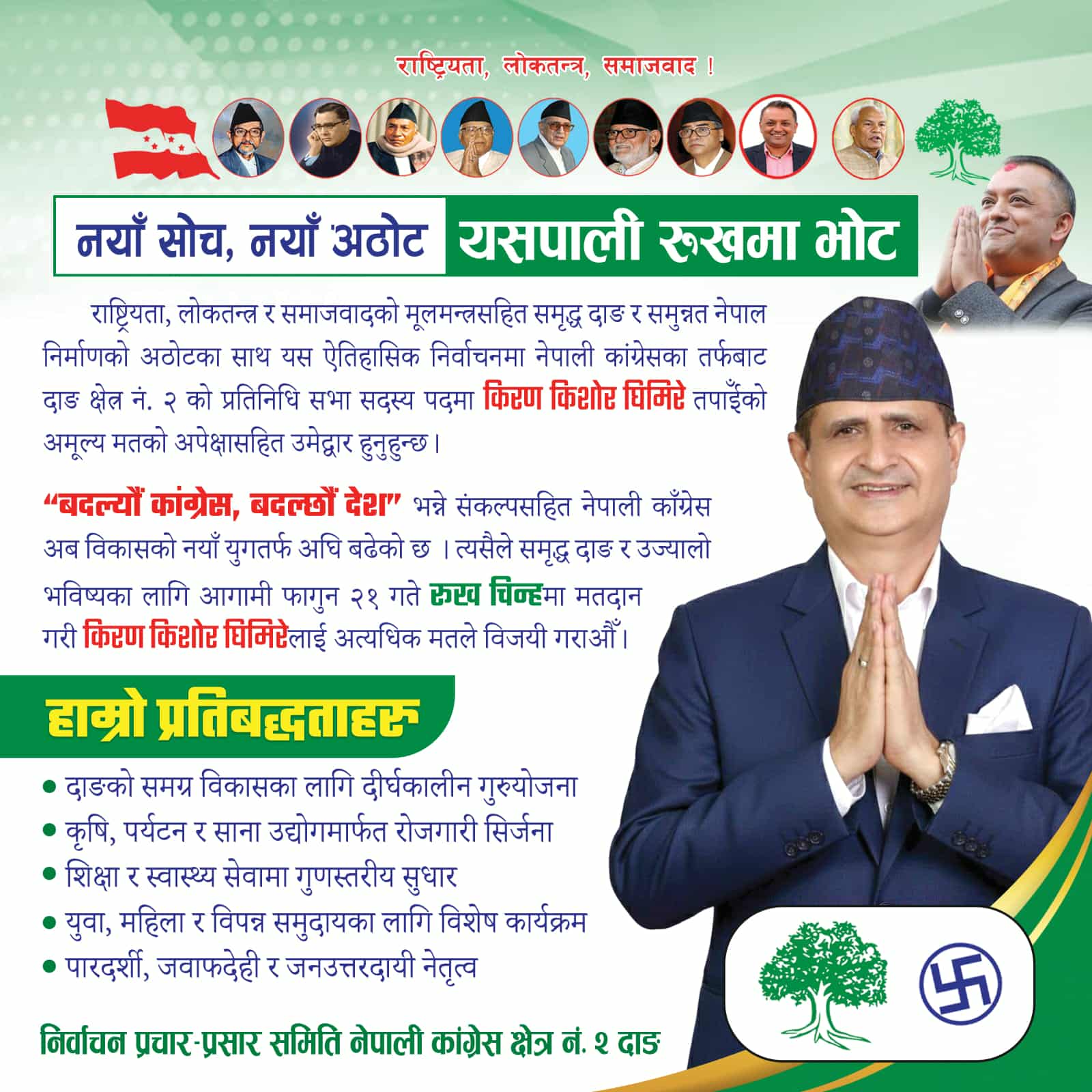 दाङ,१७ फागुन । नेकपा (एमाले) का महासचिव एवं दाङ क्षेत्र नम्बर २ का उम्मेदवार शंकर पोखरेलले साझा जनप्रतिनिधिका रुपमा दाङको विकास र समृद्धिको नेतृत्व गर्ने बताएका छन् ।