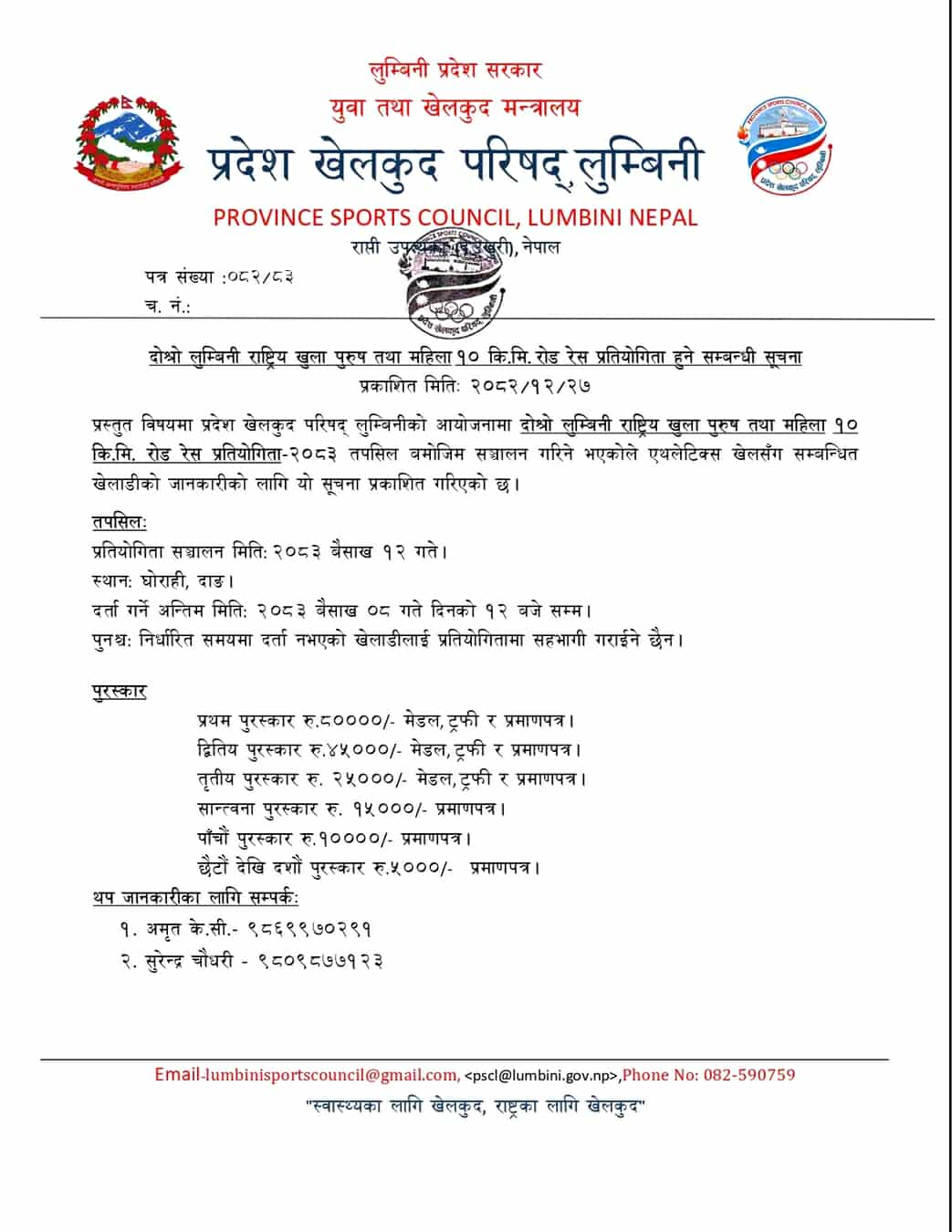 दाङ,३० चैत । दाङको घोराहीमा ‘दोश्रो लुम्बिनी राष्ट्रिय खुला पुरुष तथा महिला १० किलोमिटर रोड रेस प्रतियोगिता–२०८३’ हुने भएको छ । एथलेटिक्स खेलको विकास तथा खेलाडीको क्षमता अभिवृद्धि गर्ने उद्देश्यले प्रदेश खेलकुद परिषद् लुम्बिनीको आयोजनामा आगामी वैशाख १२ गते प्रतियोगिता हुन भएको हो ।